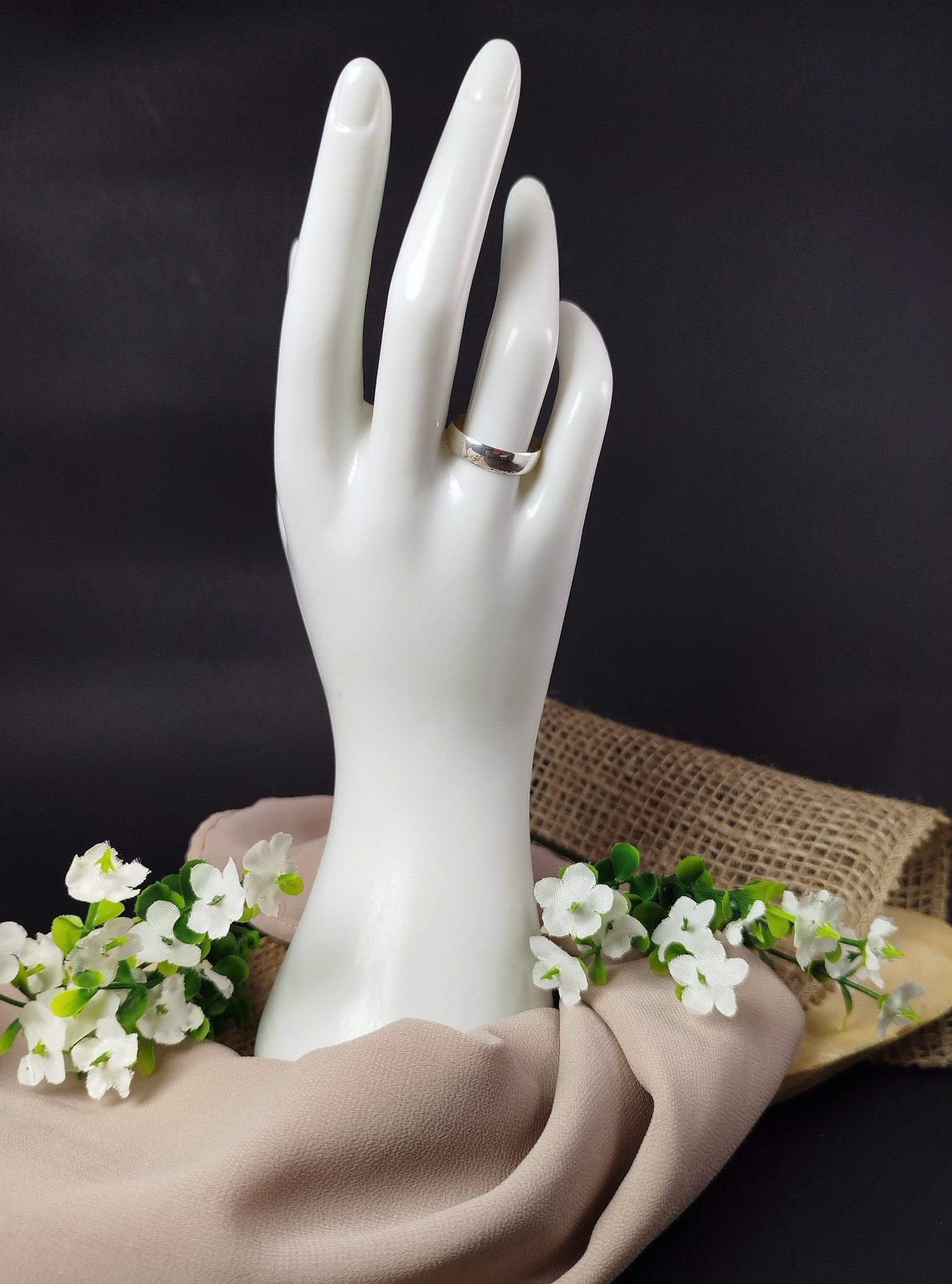 Elaborado en plata de alta pureza (950), posee un acabado pulido espejo que resalta su brillo natural y refleja la luz de manera uniforme. Su forma redondeada y superficie suave ofrecen una sensación cómoda al usarlo, ideal tanto para hombres como para mujeres.