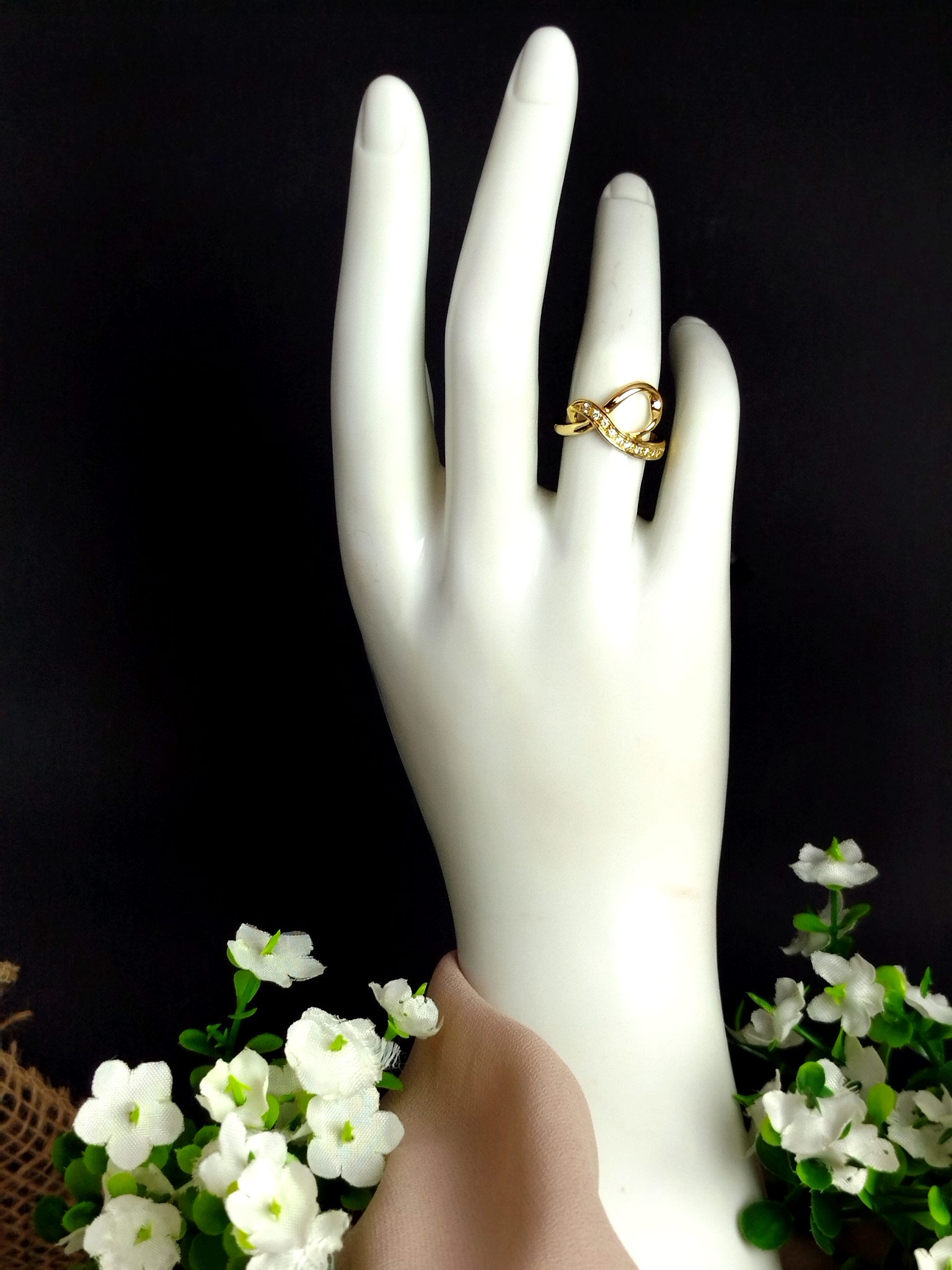 Elegante anillo en oro amarillo de 18 quilates, con un peso total de 2.72 gramos y talla 5.25, finamente elaborado con un diseño moderno de líneas curvas entrelazadas que evocan movimiento y armonía.