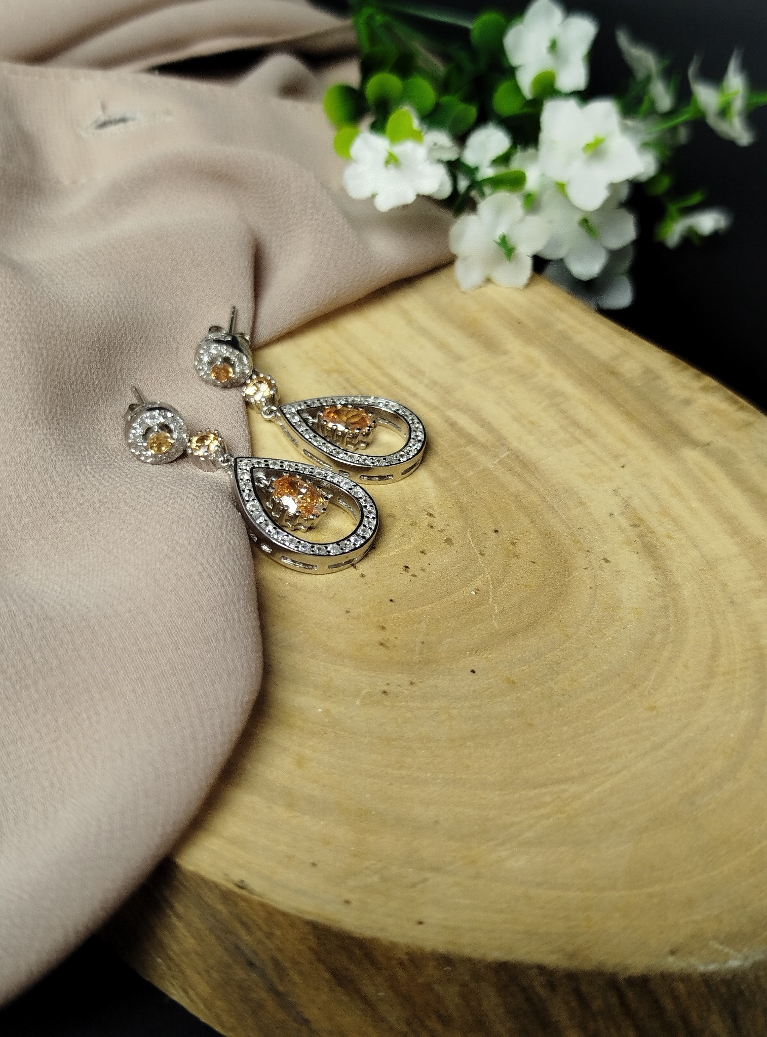 El borde de cada pieza está realzado con 27 circones plateados, que aportan un brillo intenso y elegante. En la parte superior, un anclaje de 11 circones adicionales crea una transición delicada hacia el cuerpo del arete, culminando en el centro con tres circones de color naranja, que añaden un contraste cálido y distintivo.