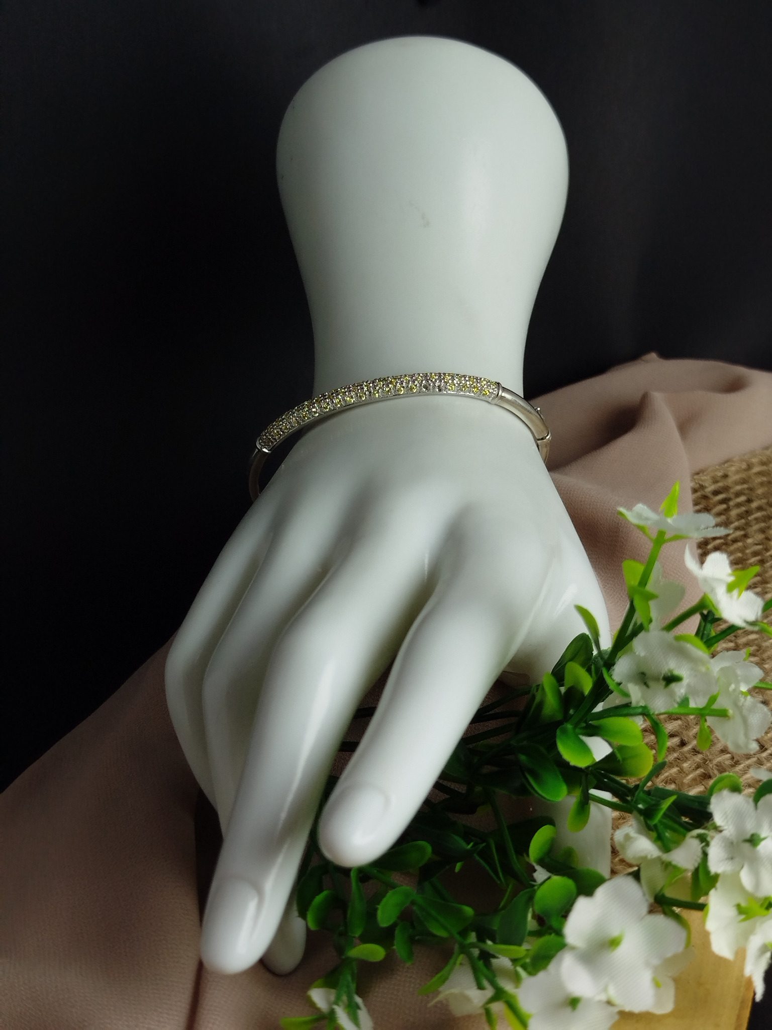 Exclusiva pulsera rígida en platino 900, con un peso total de 12.37 gramos y dimensiones de 5 × 6.3 cm.